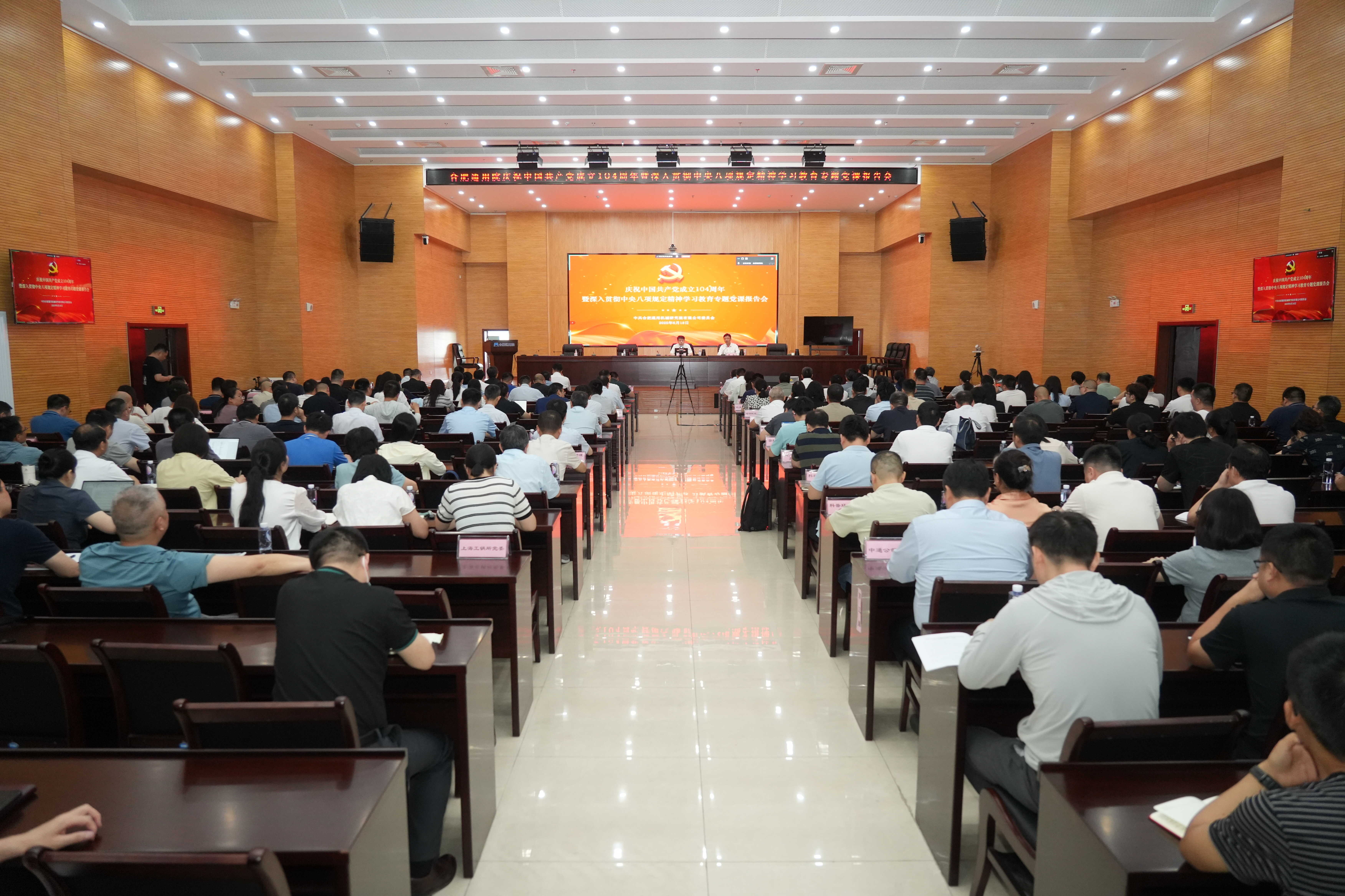 為從嚴從實推進深入貫徹中央八項規定精神學習教育,6月18日,院黨委根據學習教育工作部署和我院實際,在中國共產黨成立104周年之際,召開了慶祝中國共產黨成立104周年暨深入貫徹中央八項規定精神學習教育專題黨課報告會。黨委書記、董事長范志超作專題黨課報告,紀委書記周斌主持會議。院黨委行政領導班子成員、黨員代表、部門助理及以上干部、支部書記及支委、專兼職黨務人員、新轉正的黨員及預備黨員等220余人參加會議。中通公司、上海工鍋所、北京科正平以視頻形式參會。